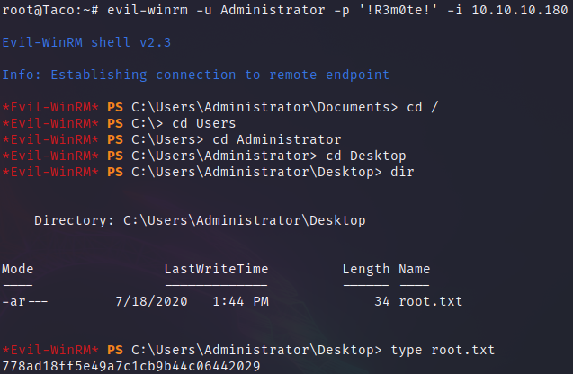 , we can log in to the machine using evil-winrm and take the root.txt flag.