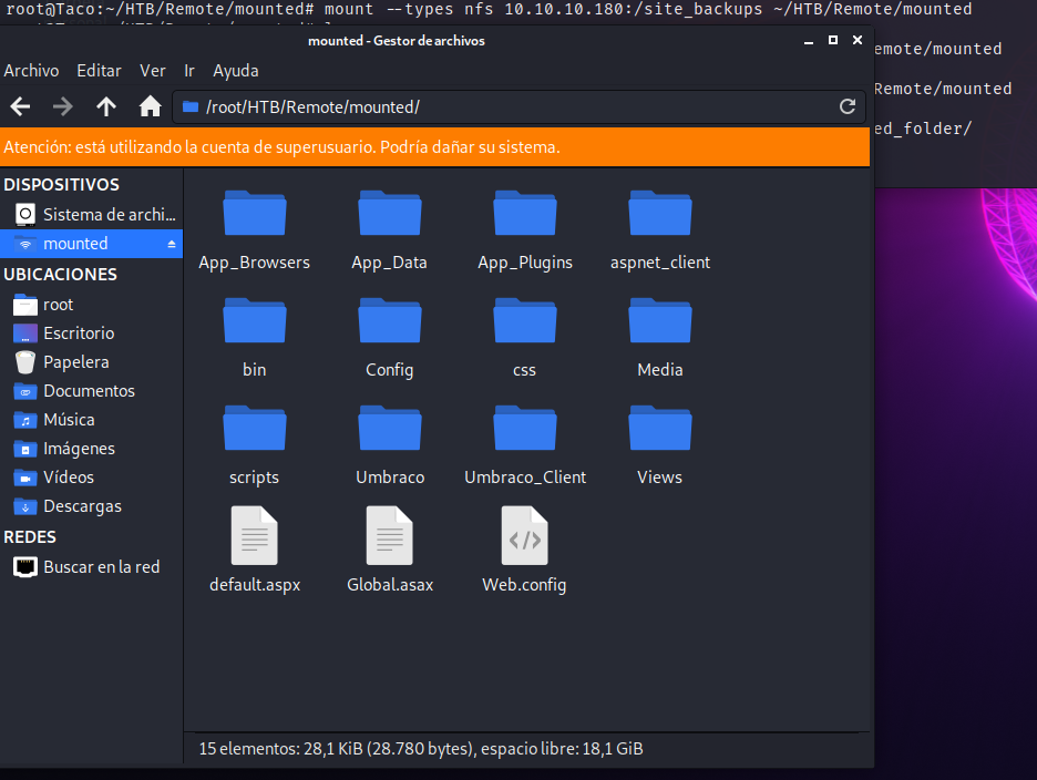 When we mount the folder, we have the files of a backup of what it seems to be an Umbraco site.