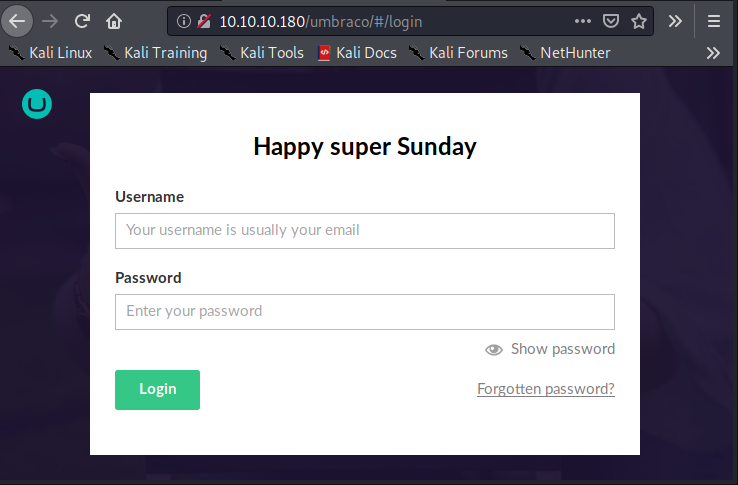 The website is an umbraco login page, without register option, so some credentials are needed to log in the site. (As SQL injections are not working in any of the parameters.)