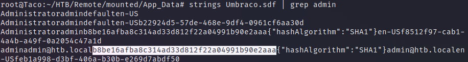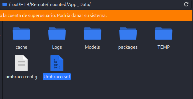 Remote is a Windows machine with the Umbraco web content manager, which is exploited through a mountable partition and cached credentials whose greatest vulnerability is an outdated version of Umbraco, what makes possible to exploit the machine.