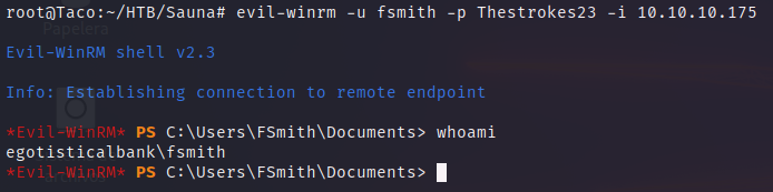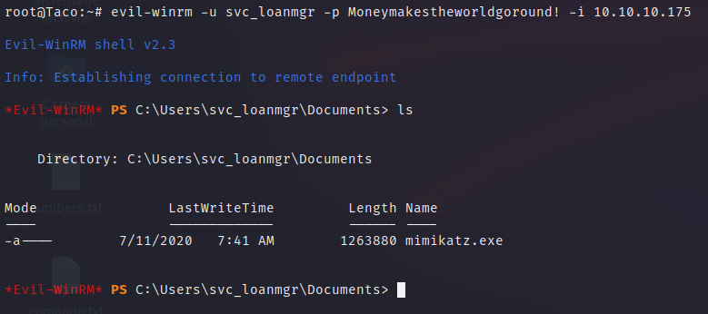 Then, we can use the credentials to connect to the machine with evil-winrm.