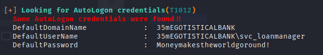 We use winPeas to enumerate the misconfigurations in the machine, and we can find AutoLogon credentials of the user svc_loanmanager