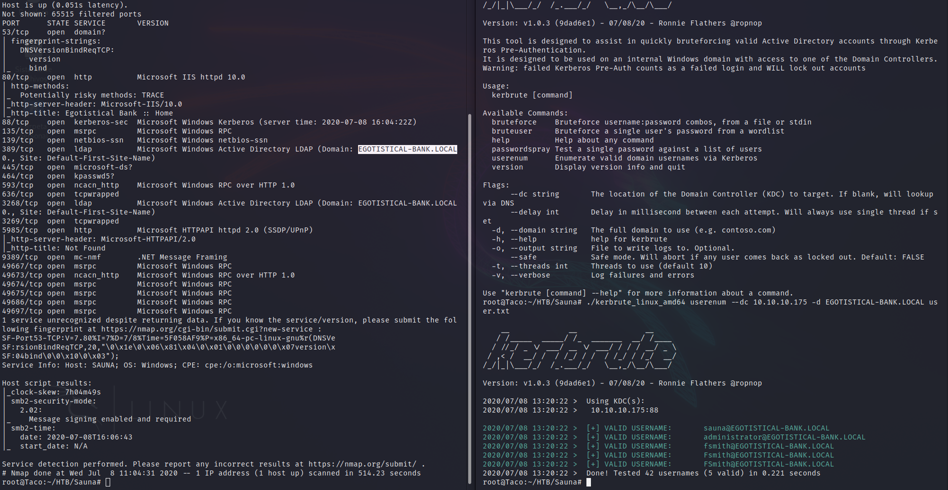 The nmap scan told us the Domain of the Active Directory hosted in the machine. Using the kerbrute tool with the userenum parameter, and providing it with our user list, the IP of the machine and the domain of the machine, the tool will perform a username guessing attack, and report us which usernames are valid usernames, so we can use them later.