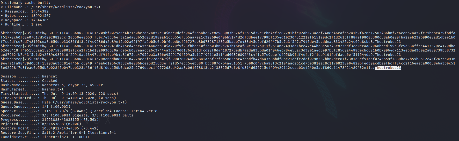 The dictionary used in the attack is rockyou.txt, and in only a second of runtime, we can see that the password is Thestrokes23