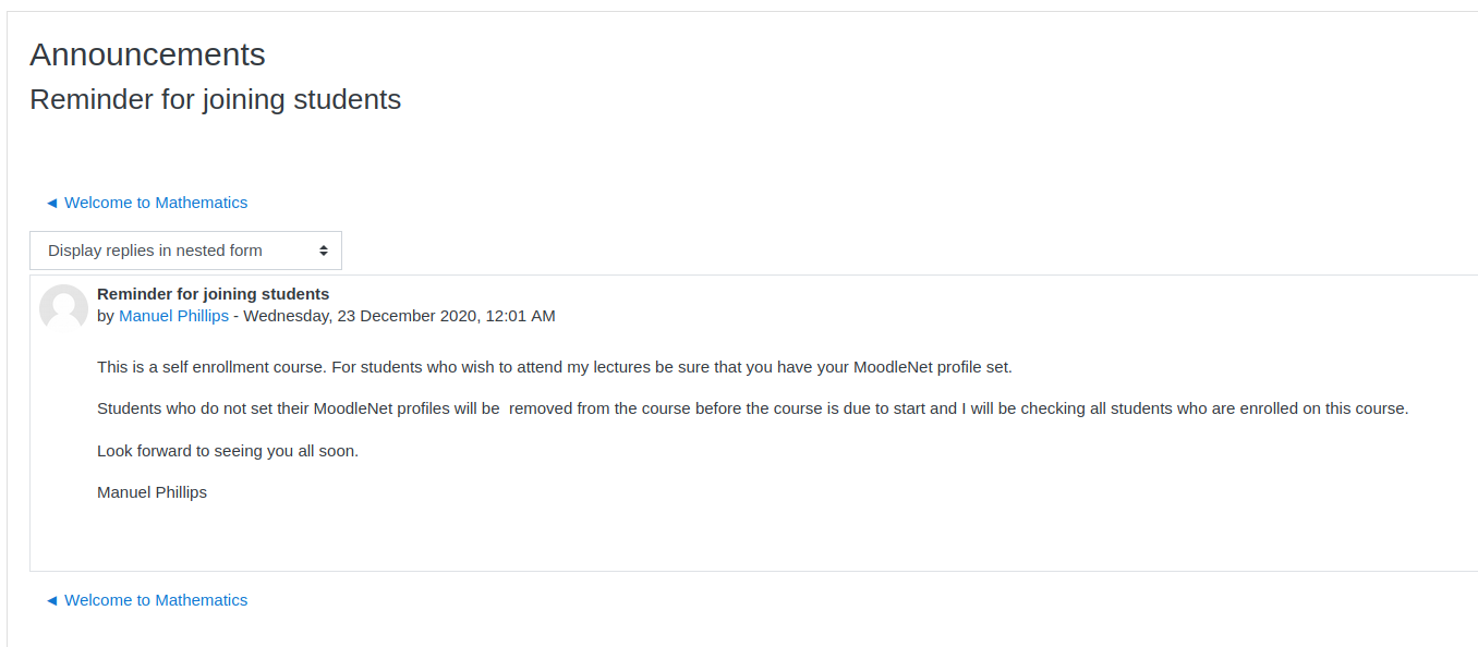 In the announcements pannel of the Maths course, there is a message of the teacher, Manuel Phillips