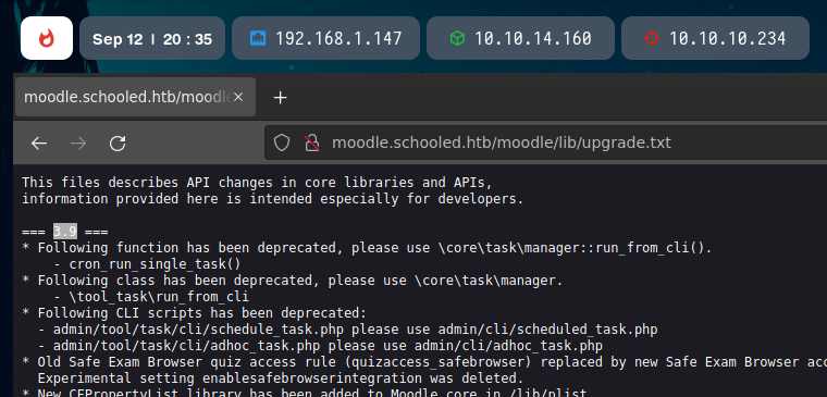 We now can only search for vulnerabilities in the Moodle, so we first need to know the version that is running. Moodle saves that information in the /moodle/lib/upgrade.txt