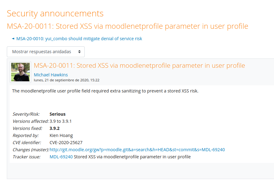 Searching for exploits for that version, and with the information we had, I found that the moodlenetprofile field of the user was vulnerable to Cross Site Scripting (XSS).