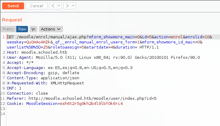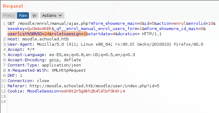 We will use her to get the manager role, enrolling her to the course, intercepting the request and modifying the parameters.