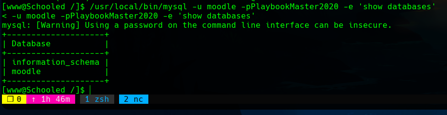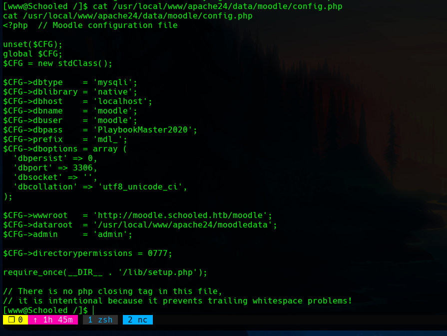 With a shell as the www user, we can read the Moodle configuration file to get the credentials of its database.