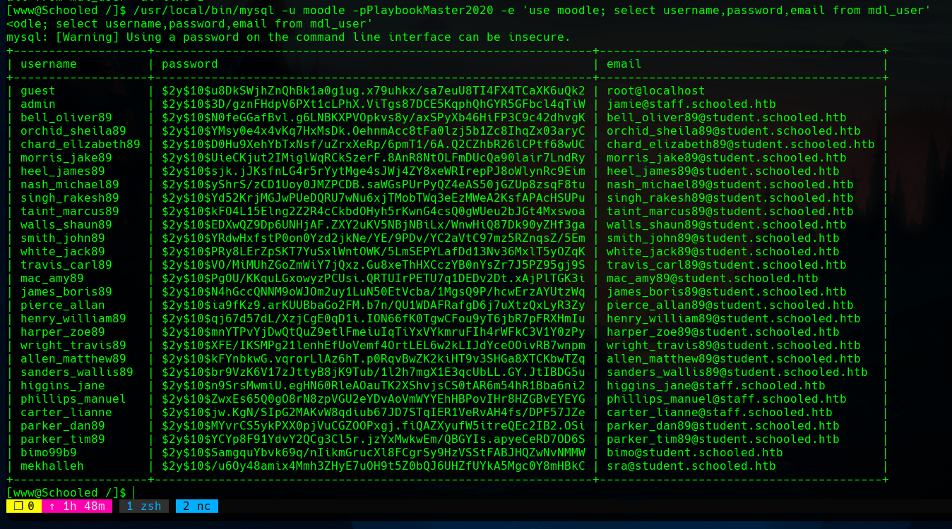 Using this credentials and enumerating the database, we can dump the usernames and passwords with the SQL query use moodle; select username, password, email from mdl_user