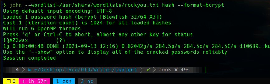 We can now crack it with john, specifying the bcrypt format and the rockyou wordlist. It can also be done with hashcat.