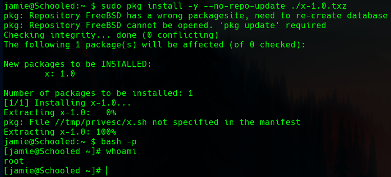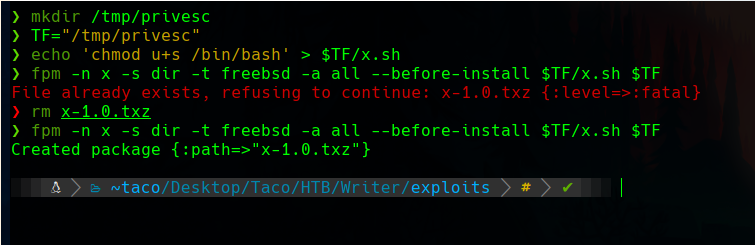 We need to create the package in our machine as we don’t have fmp available in the victim, but there is no problem with that, as we can still send it with netcat and install it as elevated user.