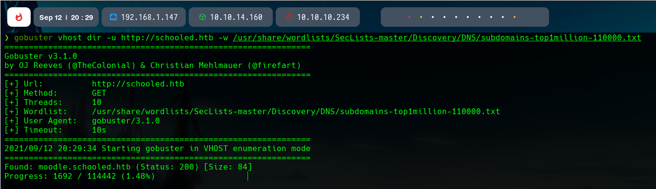 We know that the machine may be running Moodle, but to discover this with brute-force, we can use gobuster to fuzz vhosts of the main host. We will be using the subdomains-top1million-110000.txt