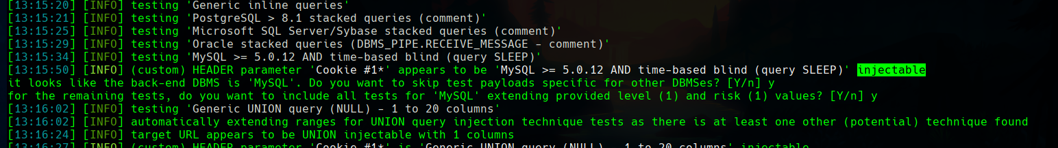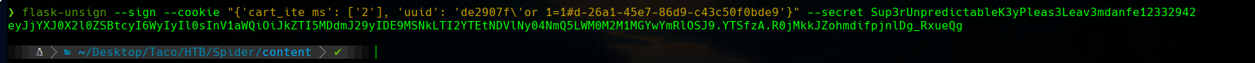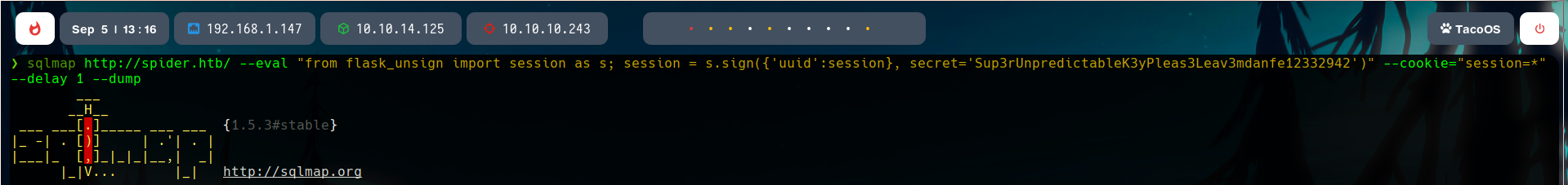 This phase is the most difficult one of the machine. We can only get to this by trying everything we know. And I thought about a simple Python oneliner to use flask unsign and the key. With this oneliner, I could test for SQL injections and is shown below.