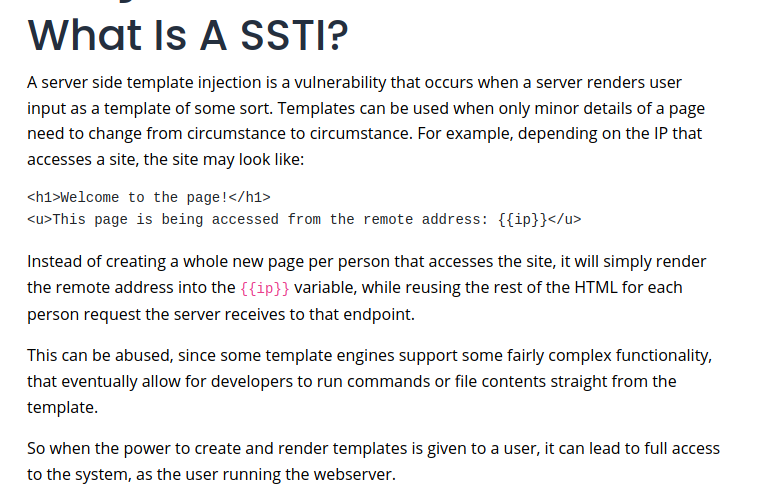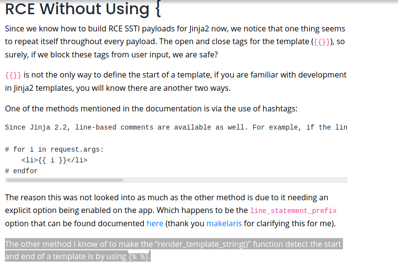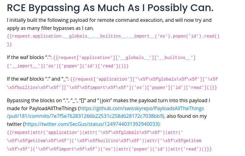 In internet there are many tutorials to get command execution with SSTI. The problem is that the page has a lot of filters, so we can not use many restricted characters and symbols. So we need to bypass them, and I found this guide.