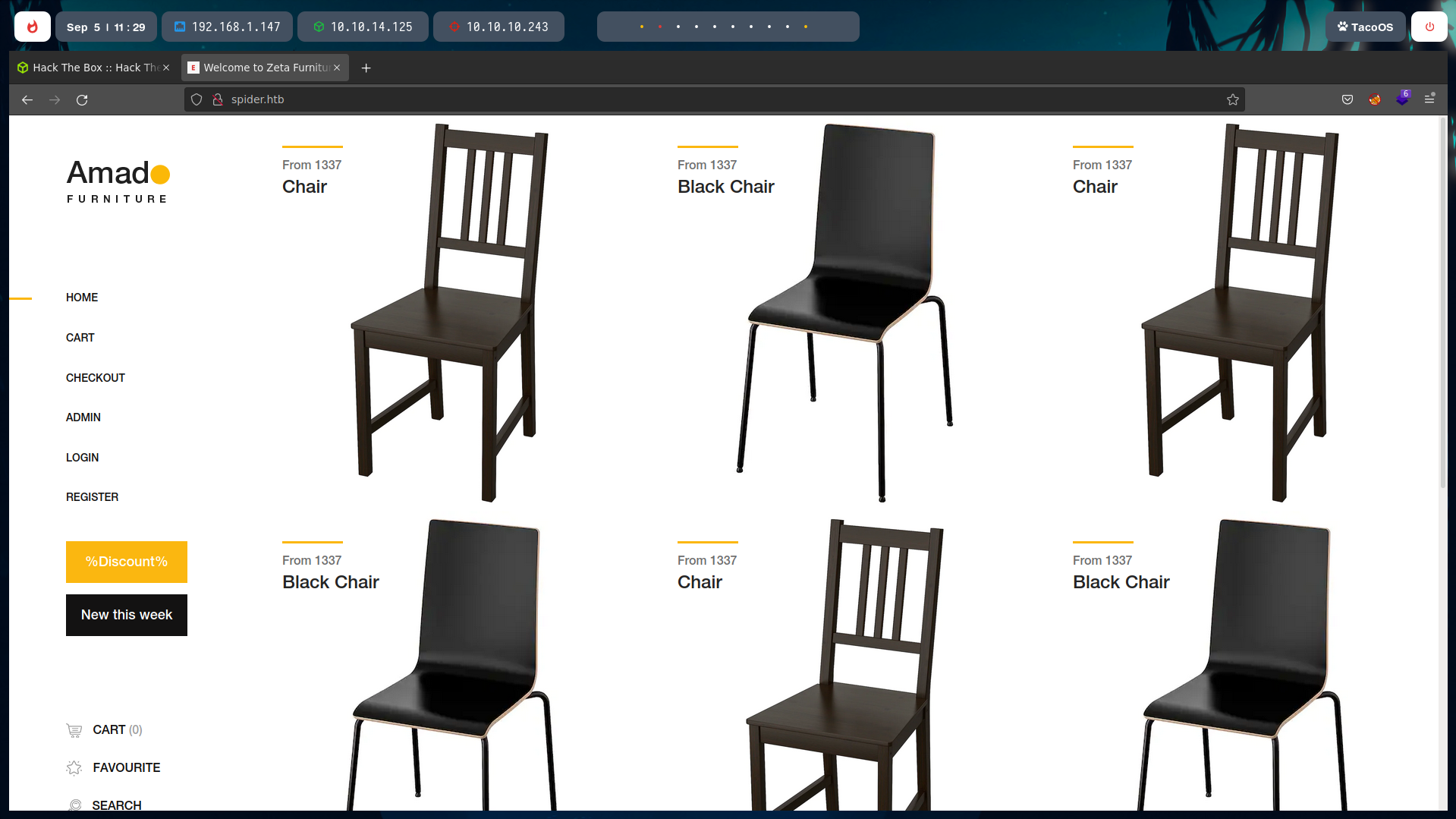 The page seems to be a furniture shop. We can look carefully and see the login, admin and register pages in the left.