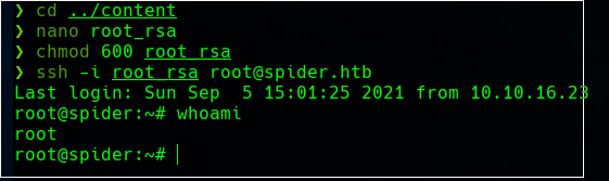 Using this private key, we can connect with SSH as the privileged user of the victim machine.