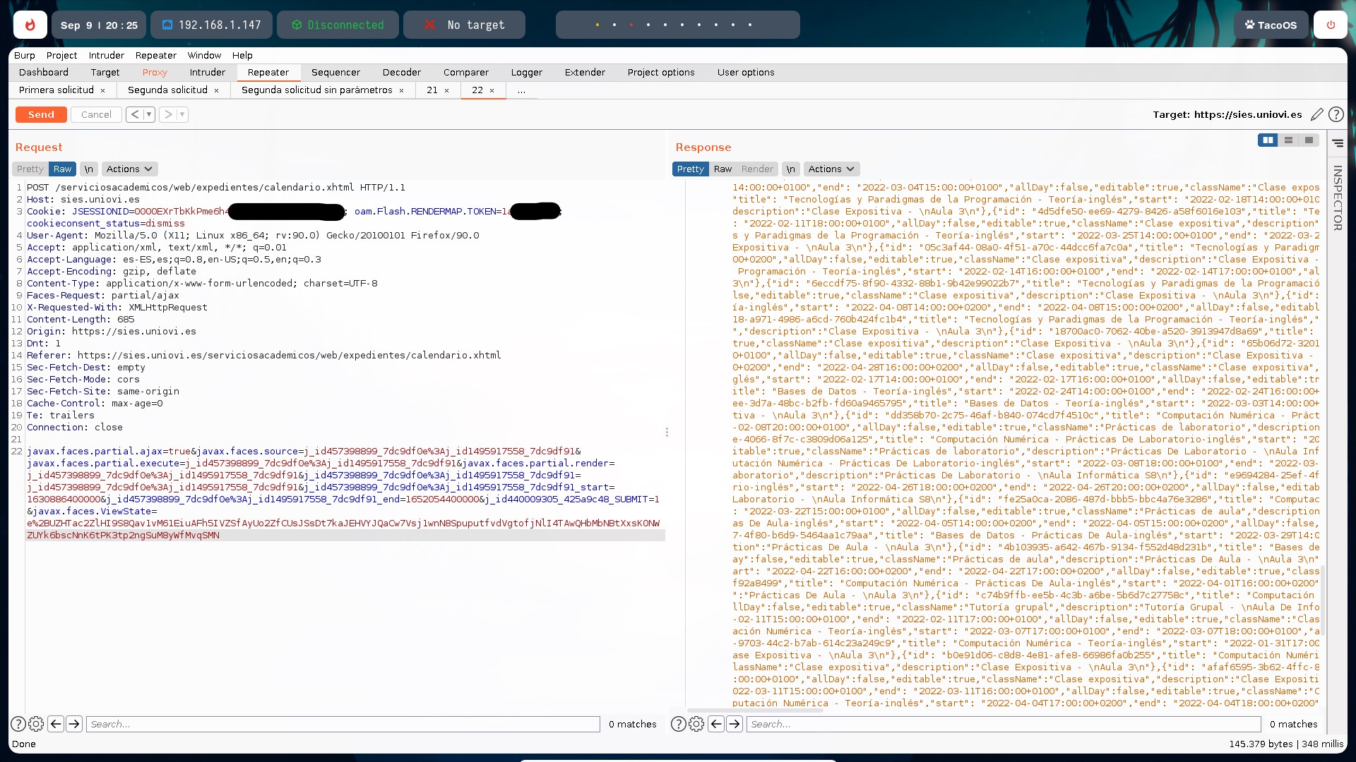 To analyze the requests done to the server I used burpsuite and foxyproxy. I intercepted the main request to load the calendar in the SIES, and realized that it was a GET HTTP request which uses two relevant parameters, JSESSIONID