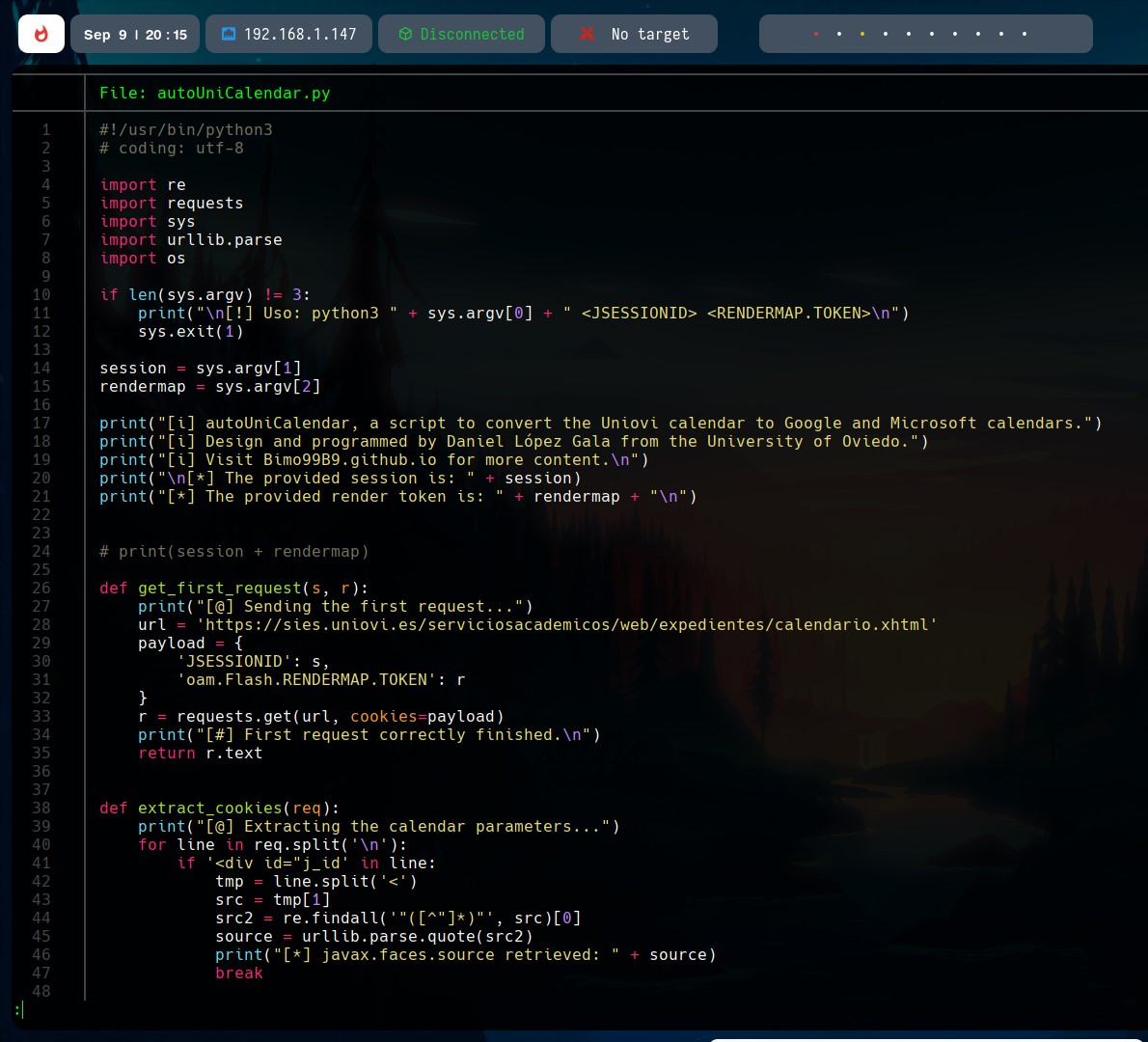 autoUniCalendar, first posted on my Twitter, and available in my Github, is a script which converts the Uniovi calendar into Google and Microsoft calendars by reading the HTTP requests to the web server, and parsing the calendar data into a CSV file readable by every calendar application.