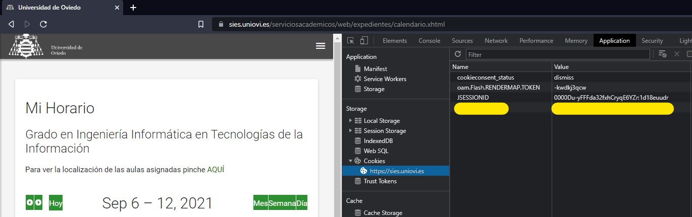 Those parameters are the cookie of the session of the user, which is a temporal identifier of its session, and from a security point of view, could only be used to impersonate the session, but we won’t have the username and password exposed, and a Flash token necessary to process the calendar. Both can be obtained pressing F12