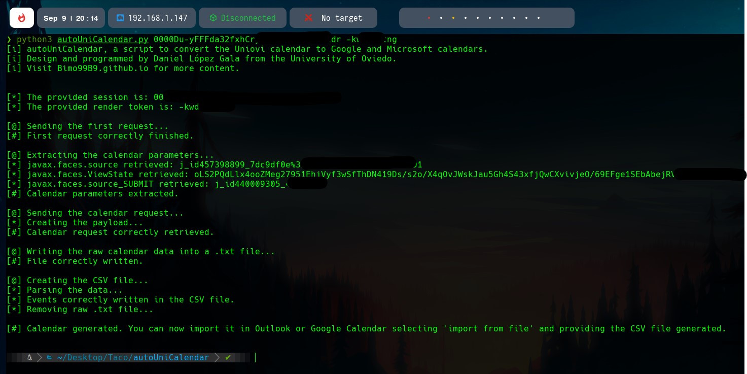 As we saw in the image of burpsuite, the data retrieved is not readable by any known program apart from the web calendar itself. Then, we have to treat the data and convert it in a CSV file with the fields that Outlook, Google Calendar and every calendar accepts.