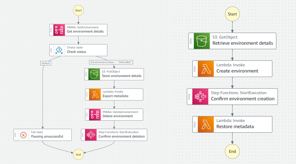 To solve this, we use two processes that create and import, and export and delete environment details before and after DAG scheduling. These two processes are orchestrated with Step Functions and scheduled with EventBridge. To save the data, a DAG pauses execution and exports in S3 all information from the active DAGs to a CSV file.