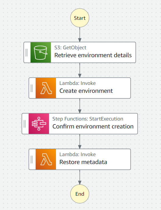 To recreate the environment the next day, the process is similar, although in this case an additional lambda is used to create the environment with the information from the previously exported environment-backup.json.