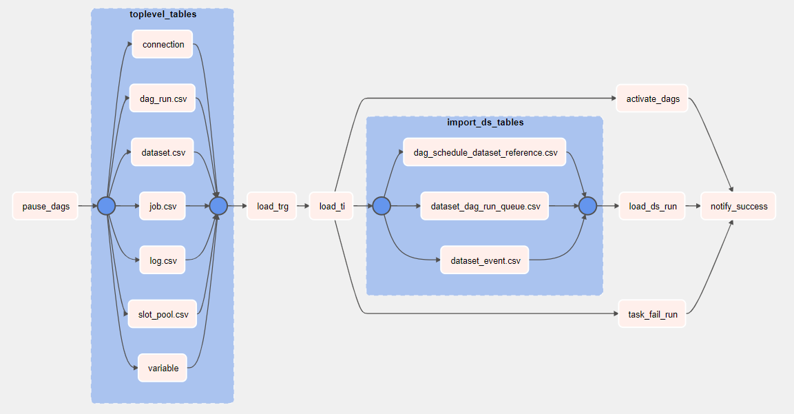 The last lambda invokes the re-import DAG when the environment finishes creating. This DAG reads the exported CSV files from S3 and re-imports it into the Airflow database, thus activating the DAGs and resuming the execution of the environment.