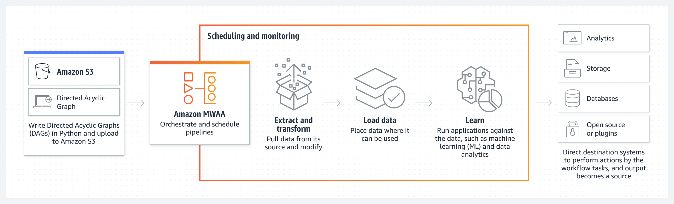Vumi is deployed on AWS, and this provider offers MWAA (Managed Workflows for Apache Airflow) as a solution for deploying an Airflow environment. It uses an S3 bucket to store DAGs, requirements, and other necessary files. In addition, it allows environments to be monitored with CloudWatch, which is very useful when the environment is not active.