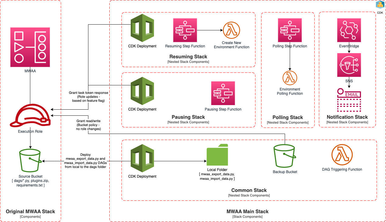 The concrete implementation has two additional stacks. One of them polls the environment to verify its creation or deletion, and to know when to run the metadata export and import DAGs. The other uses EventBridge and SNS to send notifications when part of the process fails.